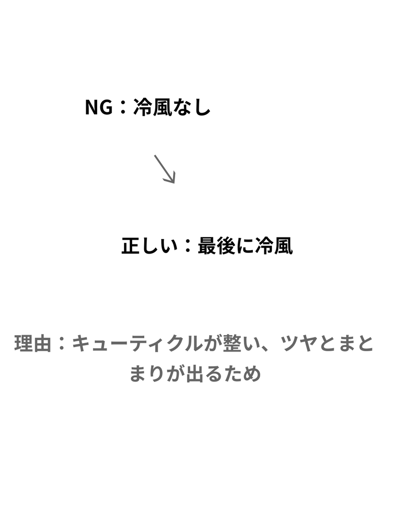 - 冷風を使わない → キューティクルが閉じずにパサつく