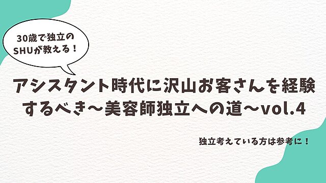 独立への道 アシスタント時代に沢山お客さんを経験するべき~美容師独立への道~vol.4 初めましてSHUです。現在(2025.8)美容師歴18年、独立して個人事業主になってから8年目のSHUです。こちらでは私の実体験をもとに書いてます。独立を考えている美容師さんや、これから美容師になろうとしている方に参考にしてもらえたらなと思... 2025.10.06 独立への道